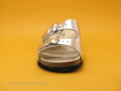 Les deux brides Ă boucle sur le dessus des mules sont ajustables sur 6 positions, pour s’adapter Ă la morphologie de votre pied.