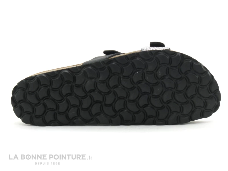 Cette mule plate est noire et argentée, avec 2 brides réglables qui permettent d’ajuster idéalement la chaussure à votre pied.