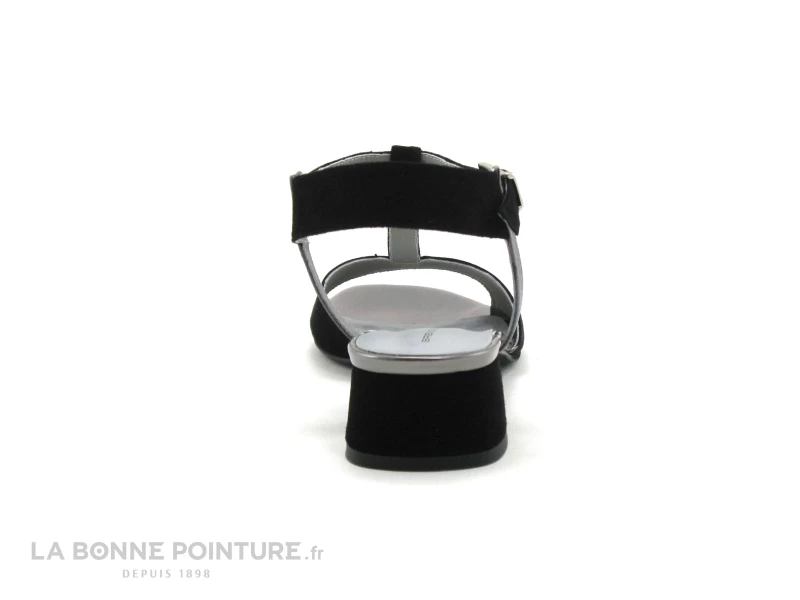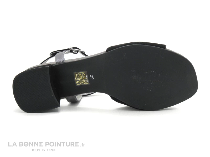 Ces sandales Femme sont en cuir velours noir, avec deux lanières argent sur l’arrière et des petits strass brillants sur la bride salomé.
