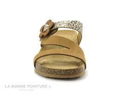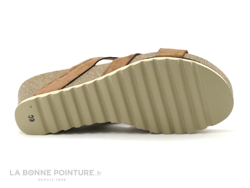 Des jolies brides en cuir souple marron croco passent sur la semelle extĂ©rieure et s’entrecroisent harmonieusement sur le cou de pied en lui assurant un maintien efficace tout en douceur.