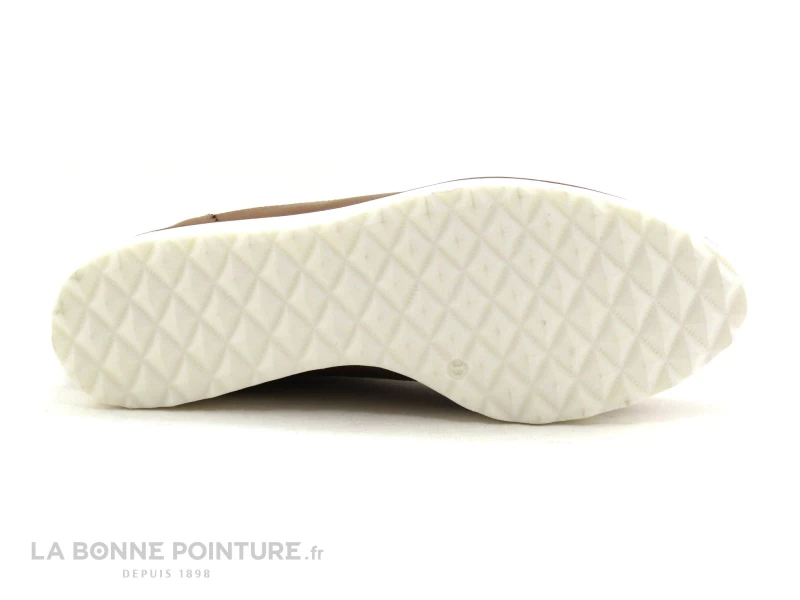 Cette chaussure Femme est en cuir marron clair, avec des empiècements argent métal, de fines perforations et des découpes dentelées…