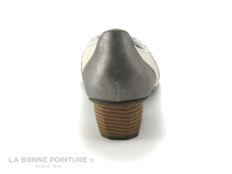 Cette chaussure femme est en simili cuir beige, avec un empiècement bronze Ă l’arrière.