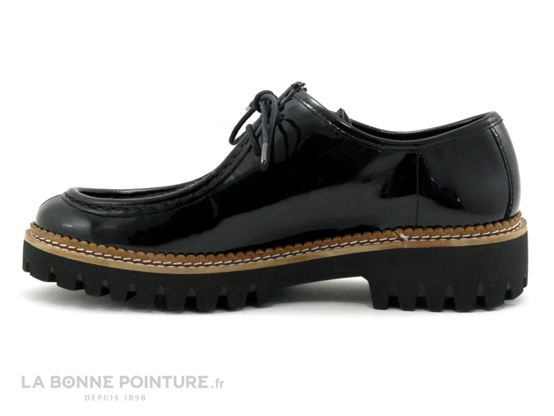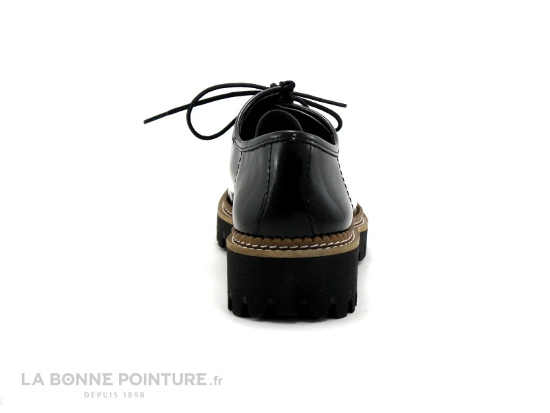 Cette chaussure femme est en cuir noir verni, avec l’avant en cuir velouté et craquelé noir et gris métal. Un liseré dentelé marron camel orne le pourtour, et donne une belle finition au modèle.