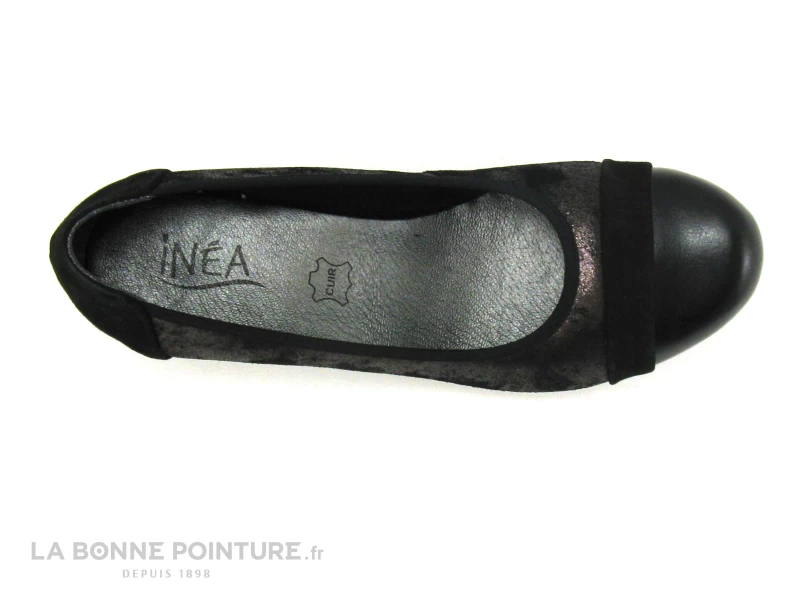 Cet escarpin confort Inéa est noir et bronze métallisé, avec un bandeau velouté sur l’avant.