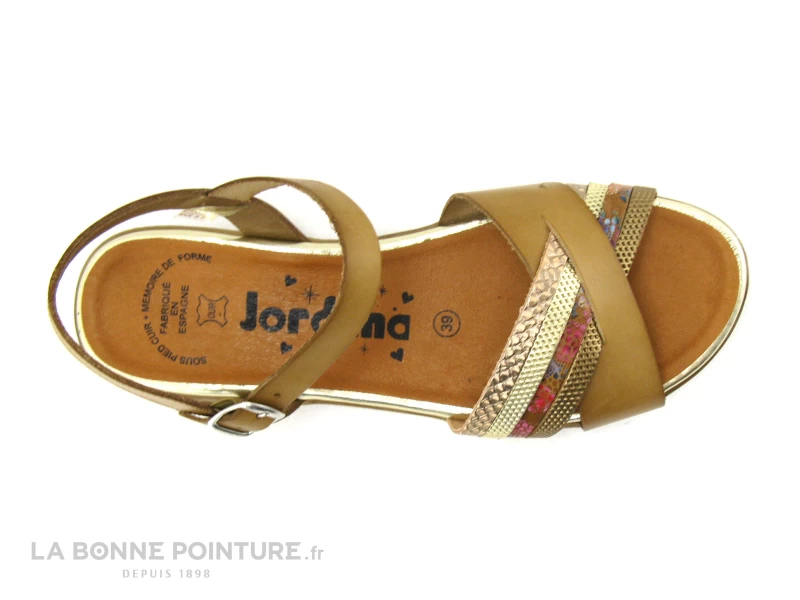 Ce nu-pieds mode Femme Jordana est principalement en cuir marron clair, avec de fines lanières métallisées et imprimées.