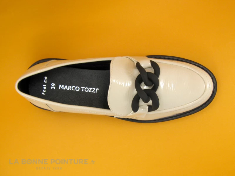 Ce mocassin plateforme Marco Tozzi 2-24705-29 est en simili cuir blanc cassé, à l’aspect verni et lègèrement plissé.