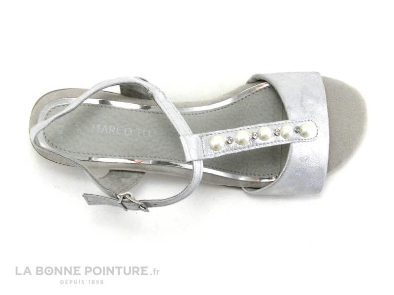 Cuir mĂ©tallisĂ© et petites perles pour ces ravissants nu-pieds en cuir argent Marco Tozzi 2-28213-22, des sandales mode Femme Ă petit prix pour l’Ă©tĂ© !