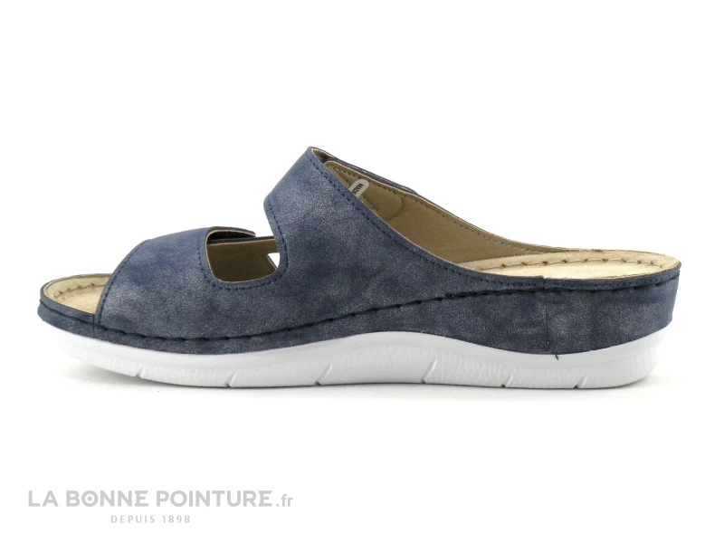 Cette mule est bleu mĂ©tallisĂ©, avec un peu de gris sur l’une des brides.
