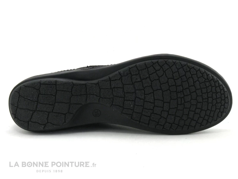 On note que le tour de cheville et la semelle sont matelassés, pour un meilleur confort dans le derbi cuir noir Femme Morans Guillac.