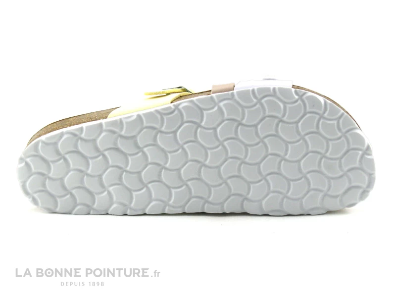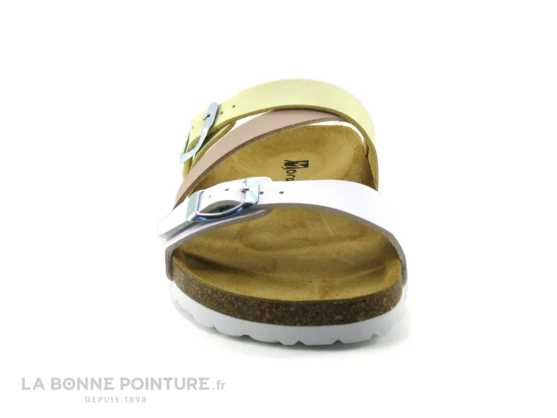 Des tons doux de jaune pastel, de rose et de blanc pour ces jolies mules Femme Moran’s Joux !