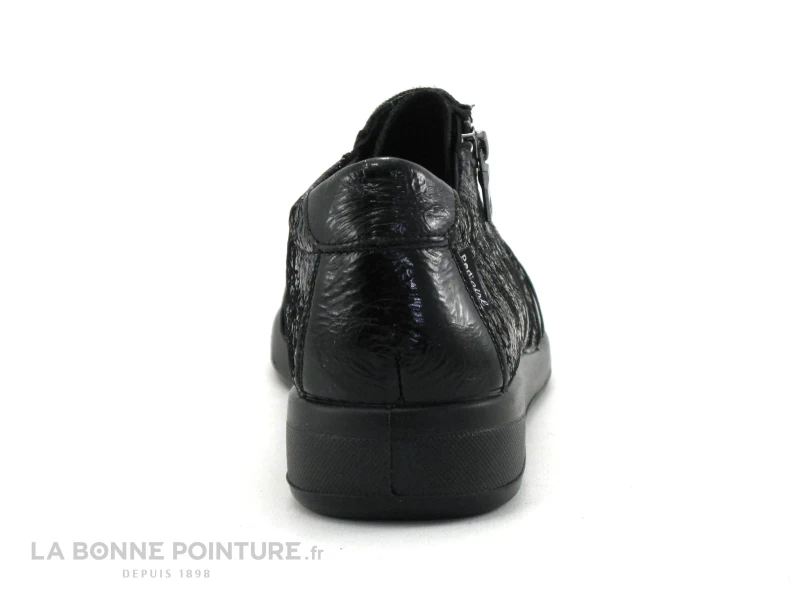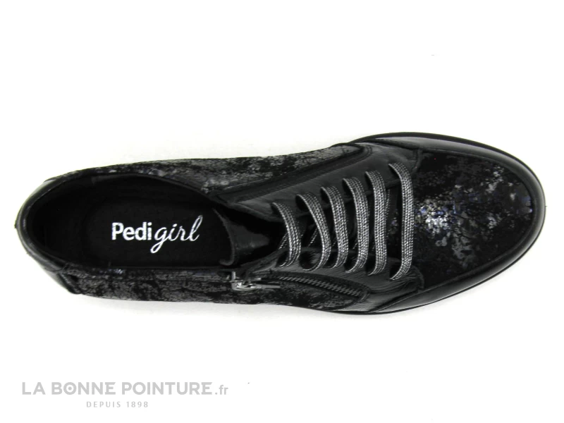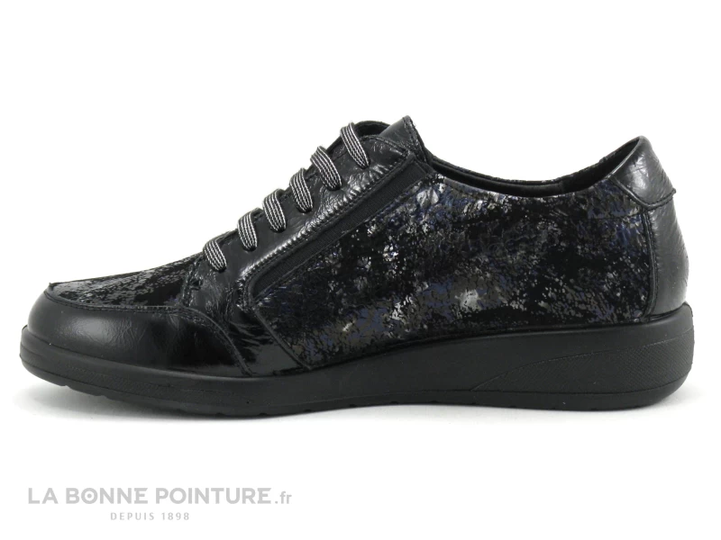 Cette basket mode et confort Femme Pedi Girl associe un cuir noir verni et un cuir métallisé aux tons de noir, de bleu et d’argent.