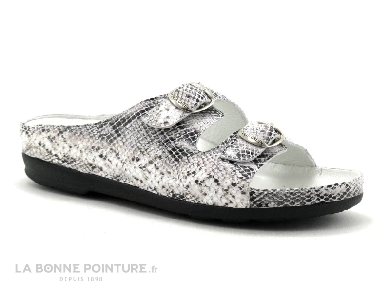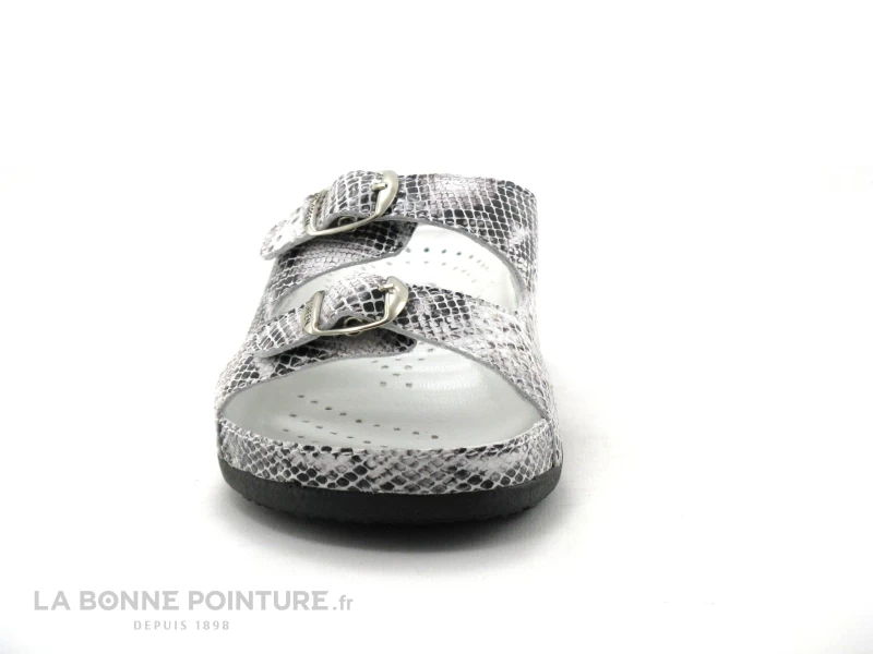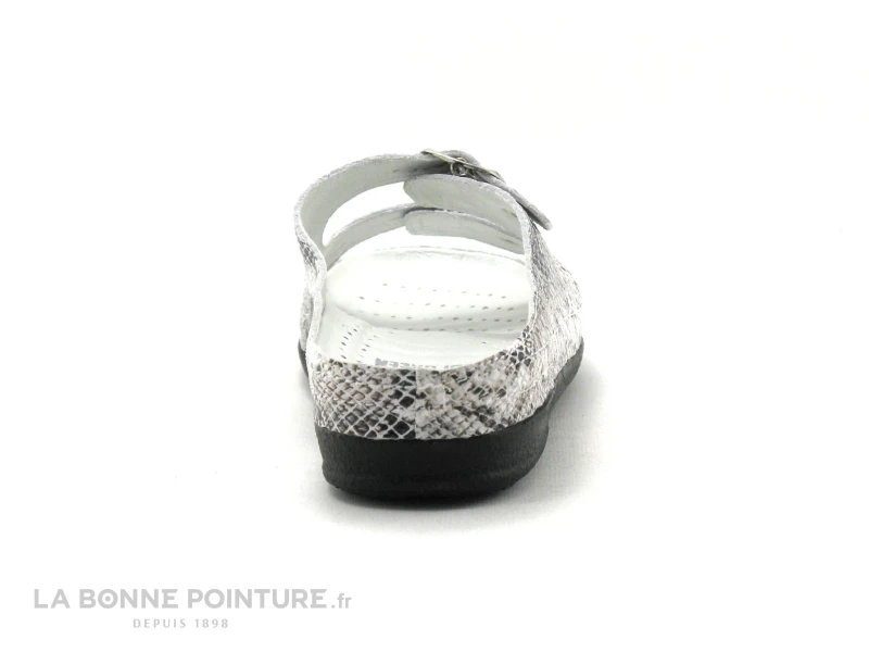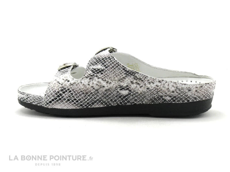Cette chaussure confort Femme est en cuir verni effet serpent, aux tons de noir, de gris et de blanc.