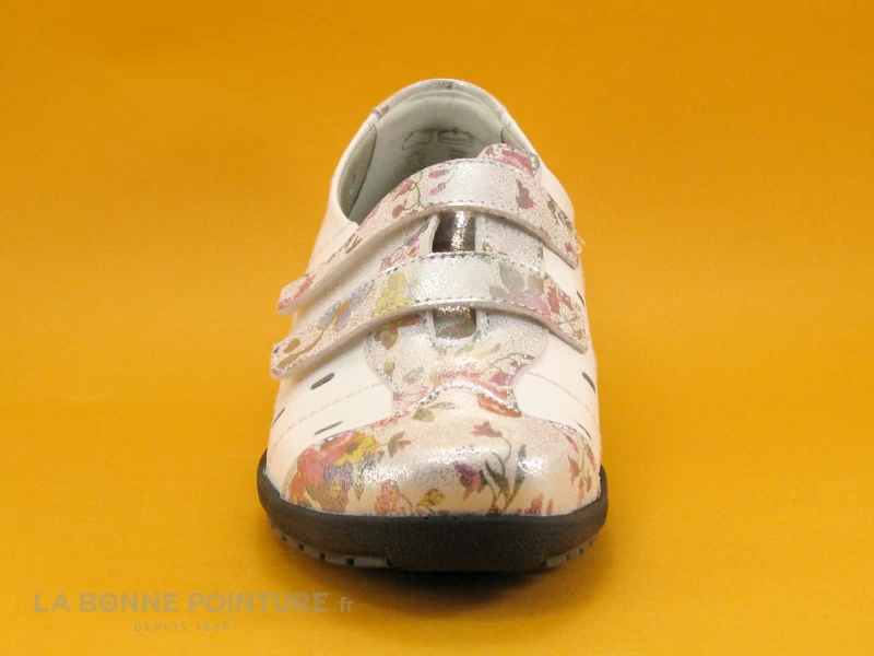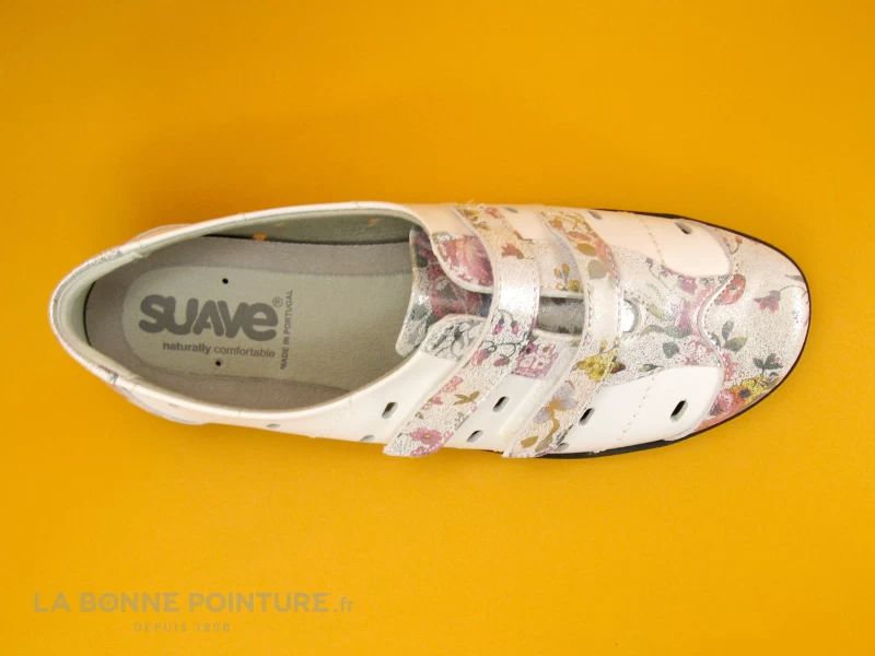 Cette chaussure Femme à velcro Suave London 8017PT est souple et très légère, associant un cuir blanc et un cuir argenté et fleuri.