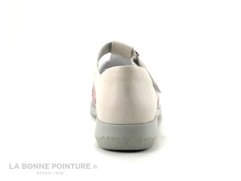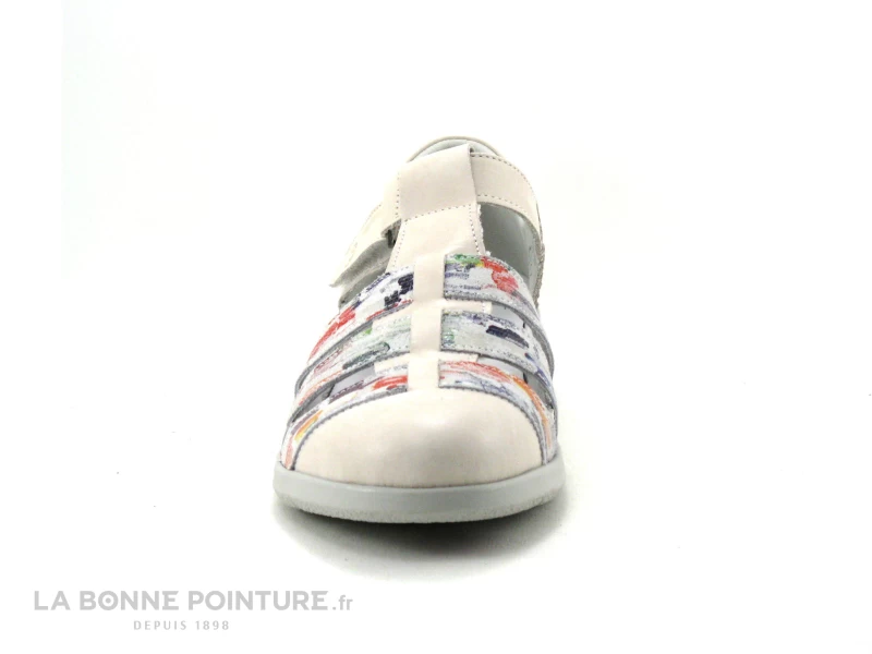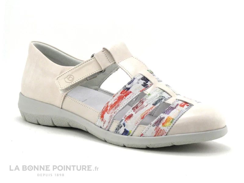 Cette chaussure aérée Femme adaptée pieds larges associe un beau cuir beige clair et un cuir velouté tacheté multicolore sur fond blanc.
