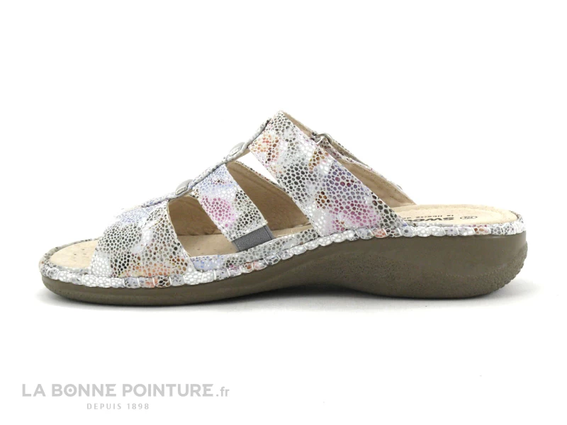 Ces mules Femme sont en simili cuir multicolore et brillant sur fond blanc.