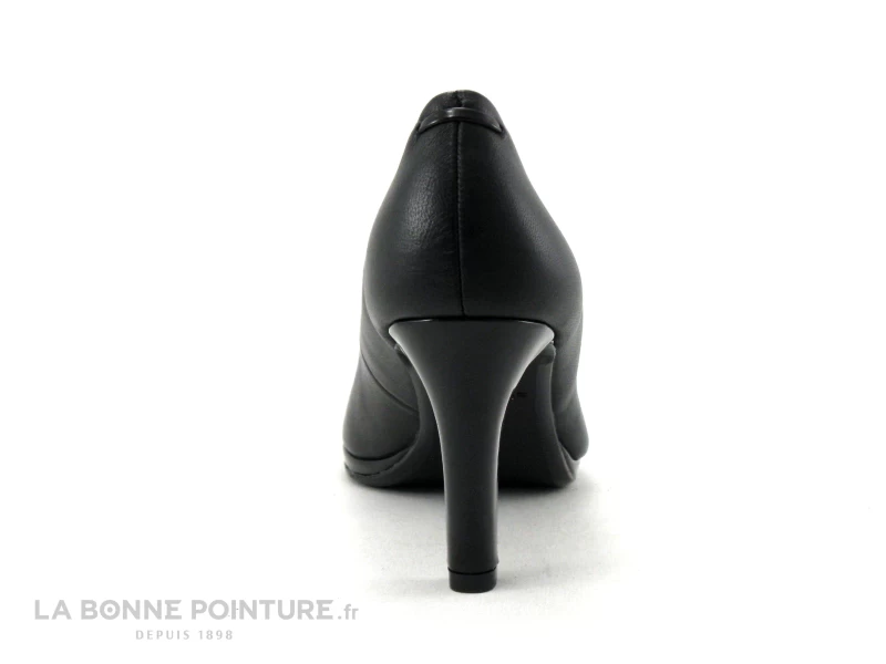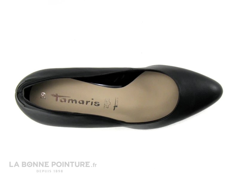 Cet escarpin Tamaris 22411 est en cuir lisse noir, orné d’un petit lien noir verni à l’arrière, en harmonie avec le talon et le patin avant.