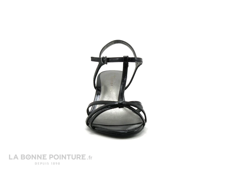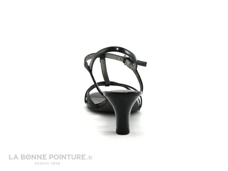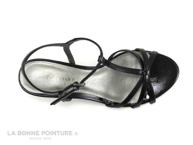 Ce nu-pieds à talon noir verni est composée de fines lanières avec une bride salomé.