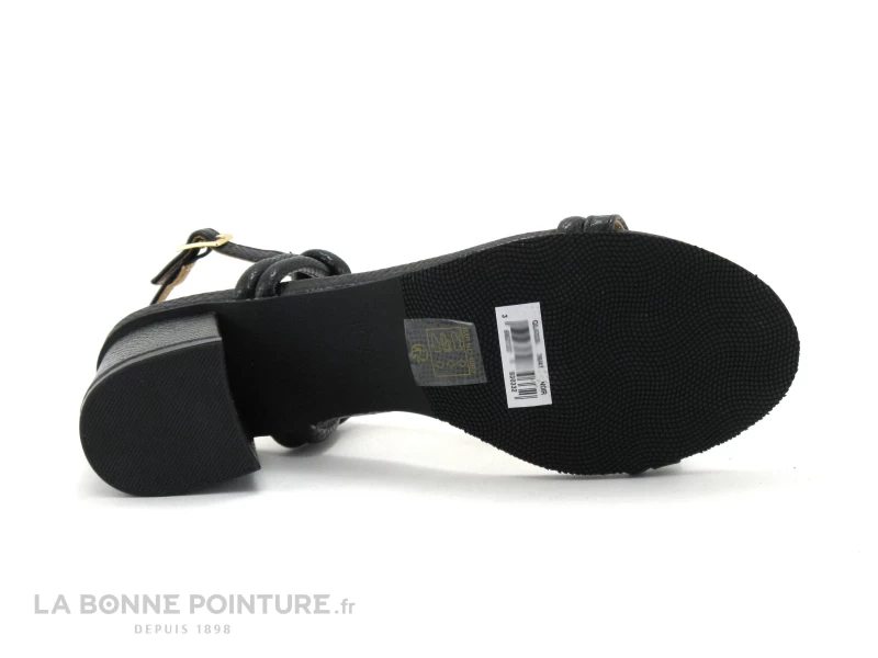 Ce nu-pieds mode Femme à petit prix est noir aspect lézard, avec un anneau marron au centre retenu par les lanières.