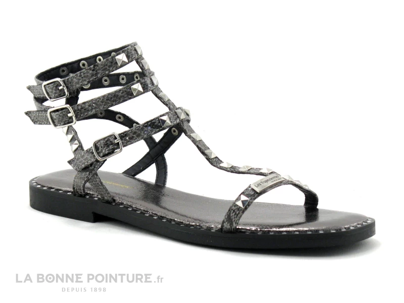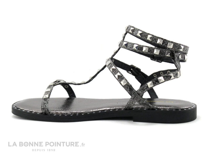 Ces séduisantes sandales montantes Femme sont en simili cuir gris aspect serpent, avec des petits picôts argentés fixés sur les brides..