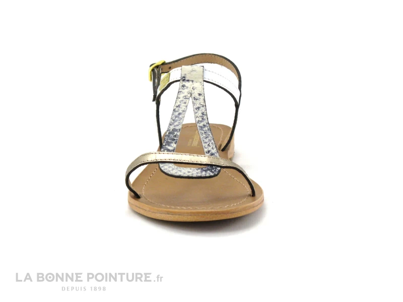 Cette sandale Femme combine un cuir blanc effet lézard, un cuir gris python et un cuir doré sur le devant de la chaussure.