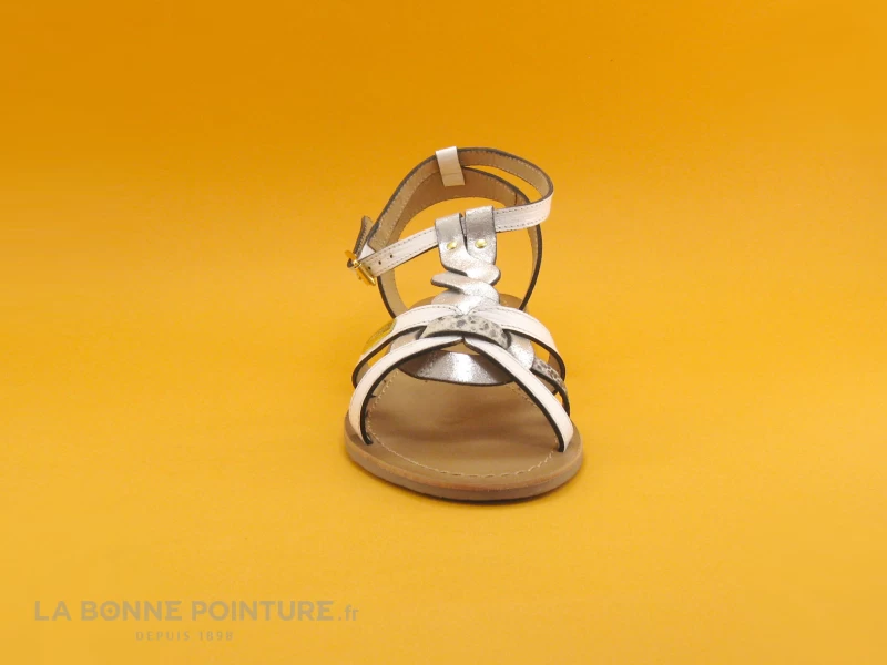 Ce nu-pieds Femme mélange un cuir argenté, un cuir blanc façon lézard et un cuir gris python, avec des lanières délicatement entrelacées sur l’avant.